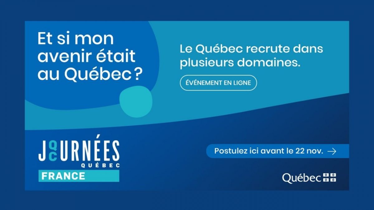 Du 30 novembre au 5 décembre 2020, c’est la 22ème édition des « Journées Québec France », l’occasion pour des candidats intéressés par la mobilité de postuler sur environ 700 emplois (dédiés aux ressortissants français / réunionnais)… En raison de la crise sanitaire, les entretiens d’embauche se tiendront par visioconférence.