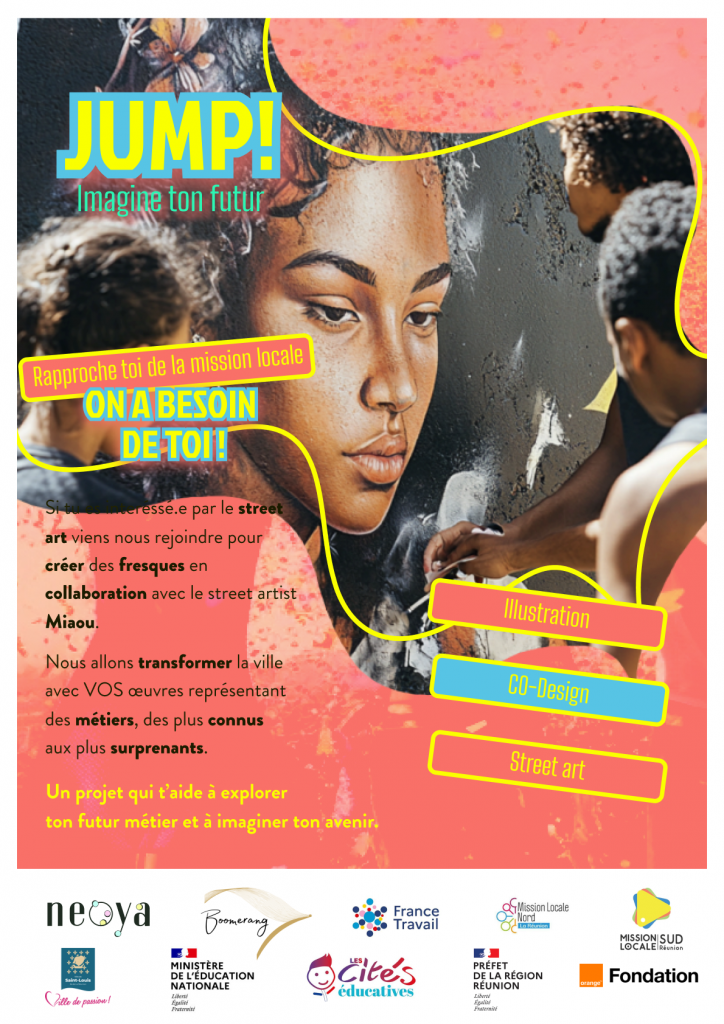 JUMP! arrive à Saint-Denis (Chaudron / Sainte-Clotilde) et à Saint-Louis (ZAC Avenir / Palissade) avec un concept simple : transformer la ville en terrain d’exploration des métiers, grâce au street art, à la réalité augmentée et à la co-création.